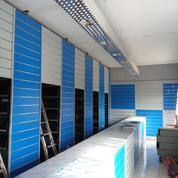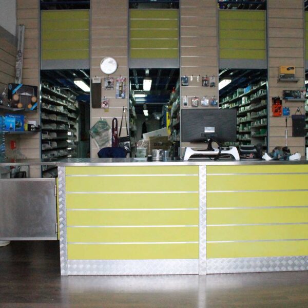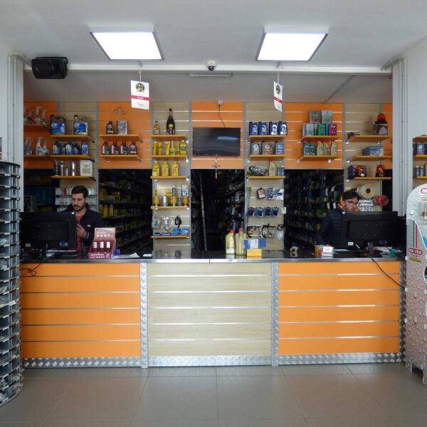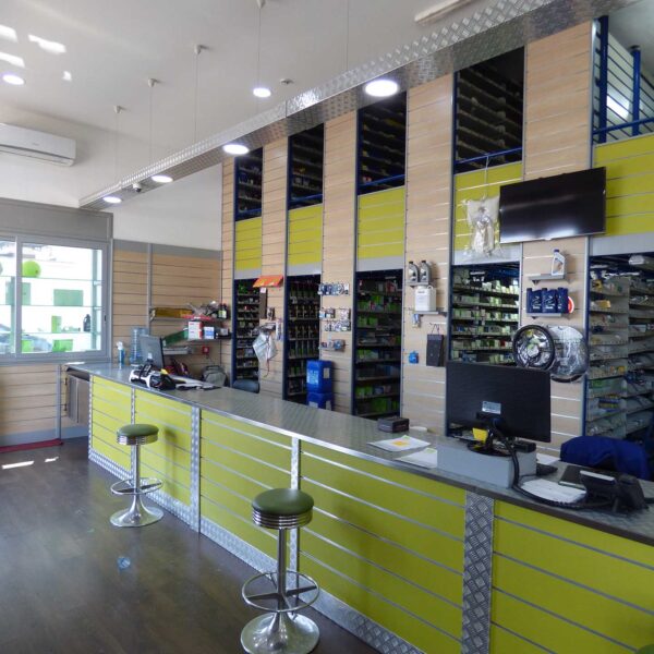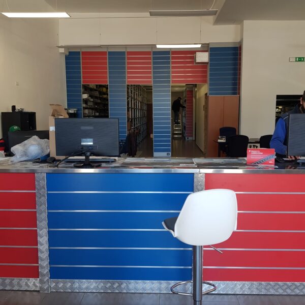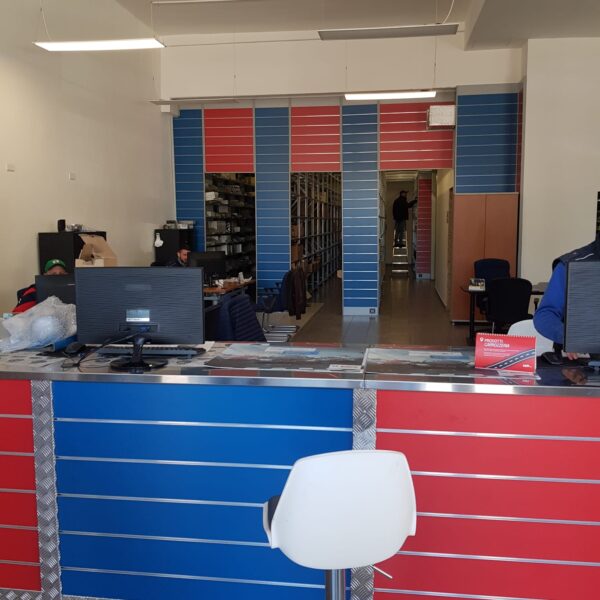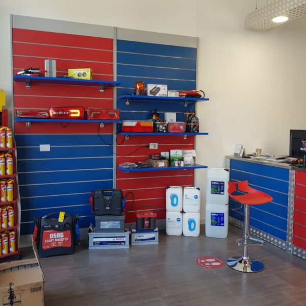 La versatilità del pannello dogato ci consente di arredare il reparto vendite senza rinunciare alla professionalità della scaffalatura autoricambi.